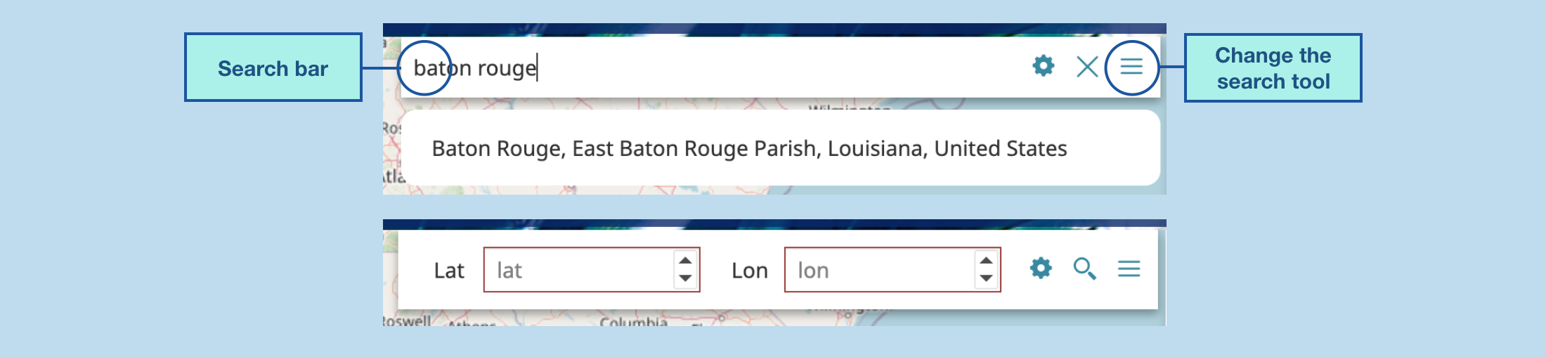 The search bar allows you to find a site of interest in the map, either by specifying an address